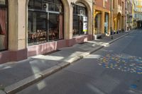 This image captures a sunny day in the city of Strasbourg, France. The photograph shows an empty alley with classic architecture and urban design. The painted sidewalk adds a touch of color to the scene. Shadows from the surrounding buildings create a classic and charming atmosphere. The storefronts and restaurants along the road invite people to eat out and do some shopping. This photo represents the vibrant urban life of Strasbourg, with its beautiful architecture, bustling streets, and inviting shops and restaurants.