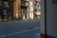 Classic architecture of a restaurant in Strasbourg, France, casts hard shadows on the empty street. Urban design blends with the urban hustle and bustle of the city. Perfect for shopping and eating out.