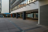 A vibrant city scene in Stuttgart, Germany. Glass windows and storefronts line the buildings on the corner, creating a modern urban design. Bars on the outside add a unique touch to this bustling urban plaza.