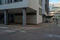 A bustling urban plaza in the heart of Stuttgart, Germany. Clear skies provide the perfect backdrop for outdoor cafes and shops. The building entrance features bicycles, a symbol of the city's urban design.