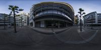 the view of a circular building with a skateboard ramp in front of it and trees