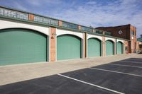 A charming suburban building in Kingsport, Tennessee. Red brick walls with green shutters house a row of green garage doors. A picturesque scene against clear blue skies.