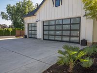 a garage that has two black garage doors and plants on the front walk way of it