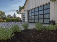 A suburban home with a garage door featuring a metal frame. The house is surrounded by well-maintained vegetation and a clear blue sky. A perfect day in a peaceful residential neighborhood.