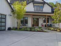 This image shows a residential home in a suburban neighborhood. The two-garage door house has a white sidinged exterior. The front yard is green and features a red fire hydrant and a black railing. The scene captures a typical day in a suburban area, with a clear sky and open space. The concrete road surface is visible in the foreground, surrounded by vegetation and trees. This photo represents a peaceful residential neighborhood with well-maintained homes.