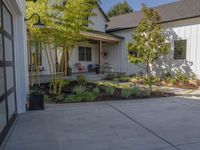This is an image of a residential building in a suburban area. The clear sky provides a backdrop for the building, which has windows, doors, and a concrete surface. Surrounding the building is a road surface, with asphalt and vegetation lining the street. The tree in the foreground adds to the suburban vibe of the scene. The photo showcases the urban design of the area, highlighting the mix of concrete and greenery. It represents a peaceful day in a residential neighborhood.