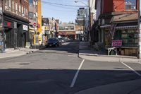 A classic architecture residential area in Toronto. Streets lined with suburban buildings and roads, casting hard shadows on the asphalt. The clear sky complements the urban design of this vibrant city.