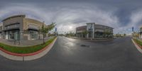 an asphalt street with a shopping center and a cloudy sky overhead at the camera taken from the same angle