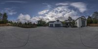 A suburban residential area captured from a fisheye lens. The house is surrounded by a well-maintained front yard with a driveway and garage. Clear sky and sunlight enhance the architecture and landscape.