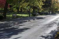 A quiet suburban road in Ontario, Canada, lined with lush deciduous trees providing shade. The road surface is asphalt, leading to a public space with park benches in the middle of a green area. A peaceful day in Toronto's suburbs.
