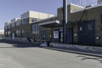 A view of a suburban Toronto street lined with residential properties and warehouses. The clear sky illuminates the architecture and road surfaces. Urban design and suburban living harmonize in Canada's largest city.