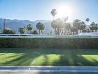 A suburban villa in Palm Springs, California. Modern architecture surrounded by clear skies and the stunning landscape of Sonora Desert. The house sits on a grass surface, with palm trees lining the road.