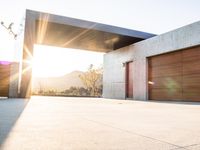 The sun shines over a garage door in a modern residential building nestled near the picturesque green mountains of Los Angeles, California, USA. The low concrete architecture of this contemporary home blends seamlessly with the surrounding landscape, complemented by the vibrant yellow facade and the sunlight filtering through the trees. This property offers a stylish and serene retreat, with ample room for parking in the spacious parking garage. The clear sky and abundant sunshine add a touch of warmth and tranquility to this delightful villa, making it a perfect choice for those seeking a modern and sun-filled sanctuary.