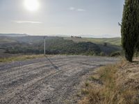 This image captures the beautiful scenery of Tuscany, Italy. The photo features an empty road surrounded by a tranquil landscape of rolling hills, green fields, and vibrant grass surfaces. In the distance, the clear sky showcases the rugged beauty of the Italian countryside. A road pole stands on one side, adding a touch of rural charm. The sunlight illuminates the scene, casting a warm glow and emphasizing the natural beauty of the area. This picture encapsulates the essence of Tuscany, with its sunny weather, picturesque landscapes, and iconic cypress trees.
