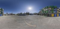 a fish eye view shows an empty parking lot in the sun and buildings in the background