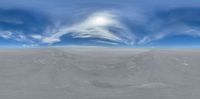 An endless salt flat landscape under the sun at Salt Lake. Bright sunshine illuminates the open space, creating a vast desert view with clouds and a skydome effect.