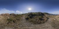 the sunny sun shines over the hillside by the water and sand shore near an ocean