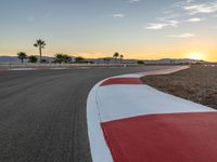 A sunlit asphalt road curves through the race track under the clear skies of dawn. The sun is visible, casting a warm glow on the racing surface. An ideal day for speed enthusiasts.