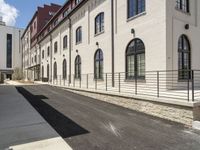 A sunny day in the city, showcasing modern architecture and clear skies. Long buildings line the paved sidewalk, enclosed by a fence. The urban design of this art district is a testament to classic and contemporary architecture.