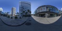 A sunny day in Barcelona, Spain. The city's modern architecture and futuristic design are on full display as towering office buildings and storefronts line the streets. The clear sky casts hard shadows, creating a visually striking urban landscape.