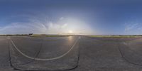 the sun shining down on a cloudless sky above an airport tarmac with some yellow cars