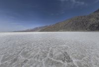 A dramatic landscape in Death Valley, California. The white sand surface contrasts with the dry ground and mountains. The sunny day adds to the emotional atmosphere of this tourist attraction.