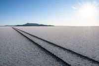 This is an image of two tracks in a barren salt flat landscape in California, USA. The clear sky and distant mountain ranges create a beautiful horizon. The sunny day enhances the natural beauty of the desert environment. The tracks on the road surface are surrounded by sand and salt lake. The image captures the vastness and serenity of the desert landscape. It represents the off-road adventures that can be explored in California's nature. The sun visible in the clear sky adds warmth to the scene.