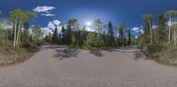 the panoramic view shows a road leading through the woods and into the sky