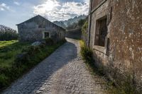 A sunny day in a picturesque European village in Portugal. Classic architecture and cobblestone roads blend seamlessly with the rugged landscape. The sun bathes the residential houses and trees in warm, golden light.