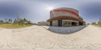 A sunny day in Hong Kong with a clear sky and a panoramic view of the cityscape. The photo captures an open space with a restaurant and a park bench surrounded by trees. The architecture and urban design are highlighted by the skyscrapers and the straight road leading to the pier.