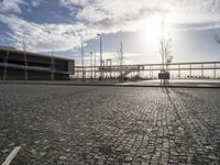 A sunny day in Lisbon, Portugal. The modern architecture and cobblestone roads create a charming atmosphere. The waterfront features a pier and jetty, with the sun reflecting off the water. Open spaces and lush vegetation add to the beauty of this European city.