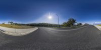 A sunny day in Merimbula, New South Wales. The sun shines over an empty street lined with modern architecture, skyscrapers, and storefronts. The cityscape contrasts with the green grass and trees on the hill. A perfect day to explore the urban design of Sydney's vibrant city.