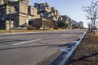 an empty road is near a street with some buildings on it in the background on a sunny day