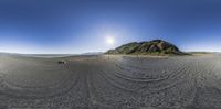 A sunny day in New Zealand with a clear sky and mountain ranges visible in the distance. People enjoy recreational activities on the sandy beach, while a straight dirt road leads to low profile houses along the coast.