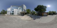 A panoramic view of a modern apartment building in Toronto, Canada. The clear sky reflects off the glass facade, highlighting the sleek urban design. The building stands tall in the bustling business district, surrounded by concrete and asphalt.