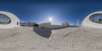 A modern architectural masterpiece in Lisbon, Portugal. The building features three circular windows, allowing sunlight to flood the interior. The clear sky and sunny weather highlight the azure hue of the building. A perfect blend of style and symmetry.