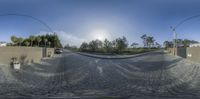 a panorama of an intersection of cobblestones in the foreground with the sun shining on the horizon