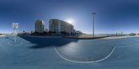 a skateboarder that is doing tricks in a city park, using the fisheye lens