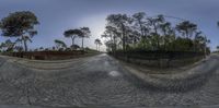 the view from a fish eye lens of a large stone road in europe with trees and bushes