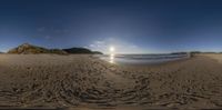 the view looking up at a beach from the sand with waves in the distance and bright sun