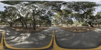 a street in the middle of trees in a 360 - shot lens setup on a sunny day