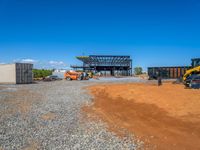 Sunny day at a construction job site in the USA. Clear sky and open space allow for a panoramic view of the architecture. Steel buildings, dirt and gravel areas, and equipment are visible on the site.
