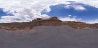Utah's open landscape under the sunny sky, with rock and dirt surfaces creating hard shadows. Gravel and sand add texture to the nature scene. Sun visible in the clear day, enhancing the rocky terrain.