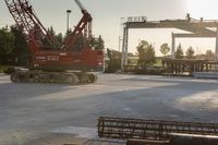 A sunny day in Toronto, Ontario, with clear skies and the sun visible. The city's industrial landscape is highlighted, with steel structures and cranes. Construction vehicles are seen against a backdrop of concrete and asphalt surfaces.