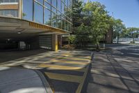 This stock photo features a parking lot in an apartment building located in Toronto, Ontario, Canada. The yellow and gray markings on the asphalt road provide clear guidance for vehicles. The parking area is surrounded by green vegetation, offering an open space for residents. The glass walls of the building reflect the sunlight, creating a beautiful play of light and shadow. The entry to the parking deck is easily accessible with a well-marked crosswalk. The clear sky adds to the overall pleasant ambiance of the scene.