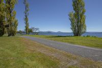 A view of a tree-lined road on a sunny day. The landscape is filled with lush vegetation and land lots. The asphalt road surface contrasts with the natural beauty of the surrounding wood.