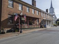 A classic brownstone building in a suburban neighborhood in Tennessee. The sunny sky highlights the beauty of the brick and stone architecture. Retail businesses line the road, adding to the charm of this urban design.