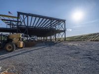Sunny day in the USA, with clear skies and a view of a construction job site. Steel buildings, dirt and gravel surfaces, and construction equipment visible. A perfect example of modern architecture in an open space.