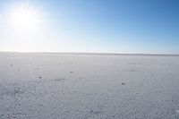 A sunny day in California's desert landscape. The open space stretches to the horizon, with an off-road track visible. The surface is covered in sand and salt, contrasting with the clear sky and shining sun. Nature at its finest in the USA.