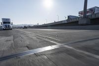 A vibrant and sunny day on a highway with motion blur, featuring an asphalt road surface. The clear sky overhead and the sun visible, casting rays of sunshine onto the road. The composite material road surface is smooth and well-maintained, with lanes clearly marked. In the distance, a commercial truck is rolling down the road. Street lights and parking lots can be seen in the surroundings, adding to the urban infrastructure. The wooden floors of nearby buildings add a touch of warmth to the scene. This race track-inspired image captures the energy and speed of a bustling city street.